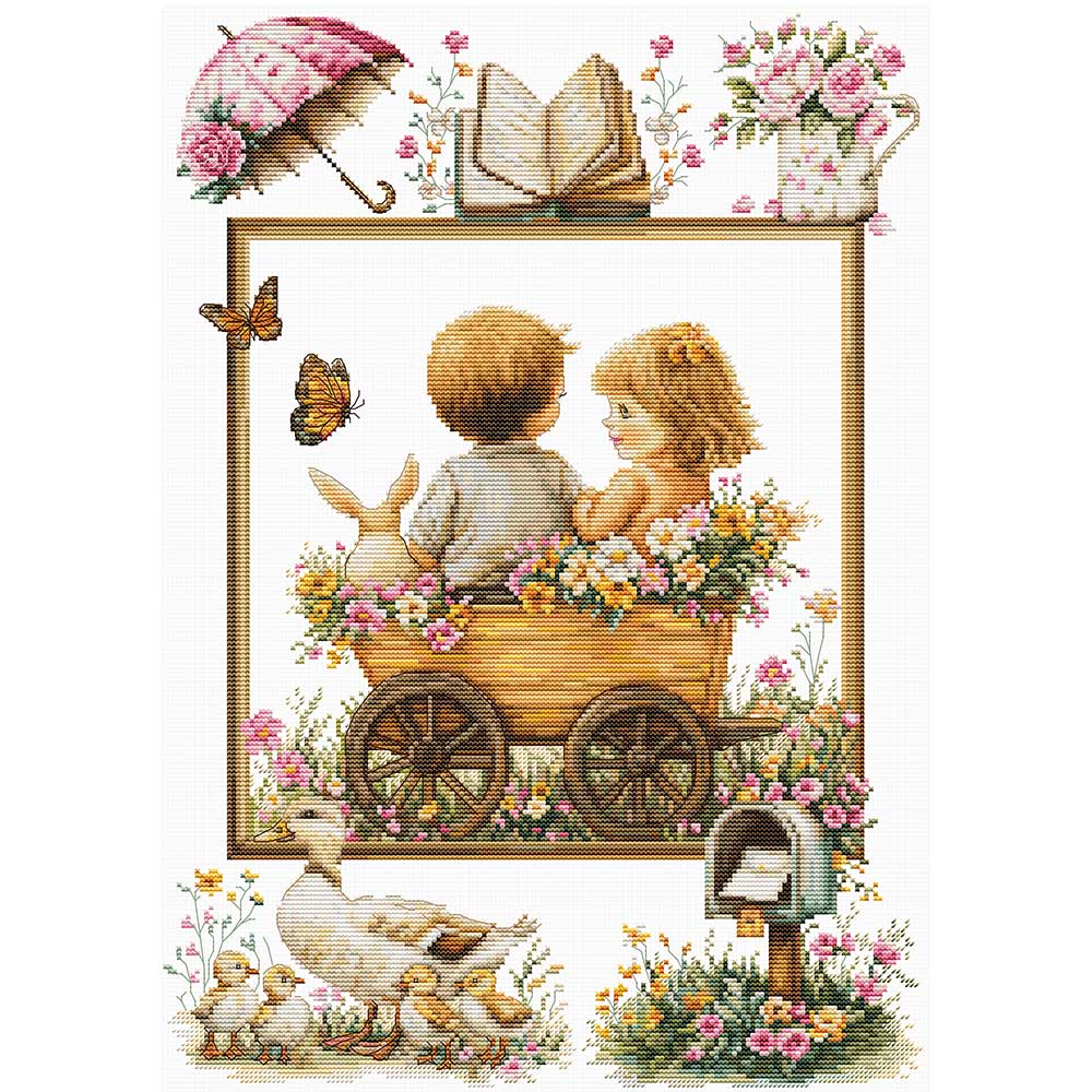 【作り方つき】木の荷車に乗った小さな子供たちの冒険を描いたメルヘンチックなクロスステッチ作品。アヒルの親子や傘など可愛らしいモチーフも描かれています。上級の方向け。Luca-S社製。