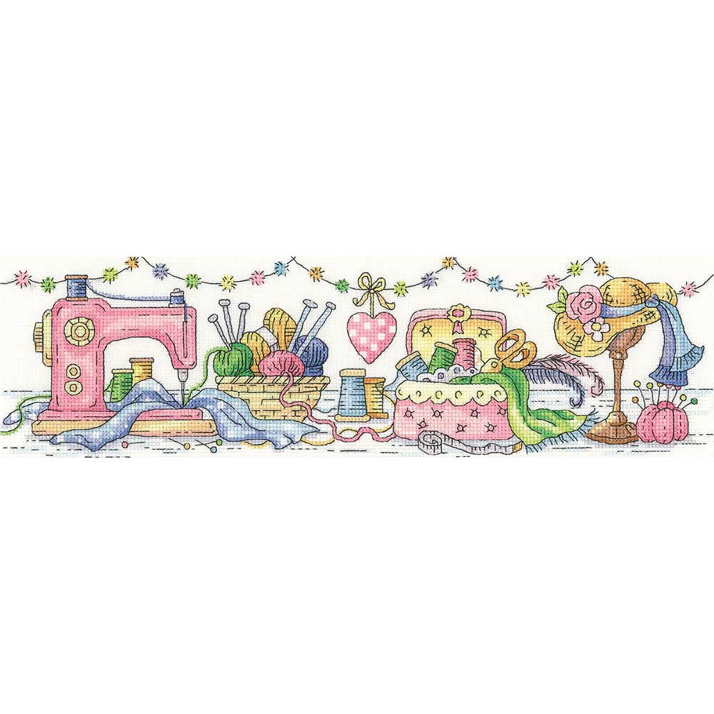 【キット作り方つき】ミシンや毛糸、裁縫道具などをポップに描いた、可愛らしいクロスステッチ作品です。上級の方向け。イギリス・Heritage Crafts社製(ヘリテージクラフツ)。