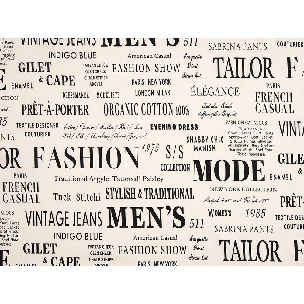 小関鈴子さんデザイン。ファッション用語をいろいろな書体で大小さまざまにランダムに配したおしゃれなデザイン。やや黄味のあるホワイト地と温かみのある濃いベージュ地です。