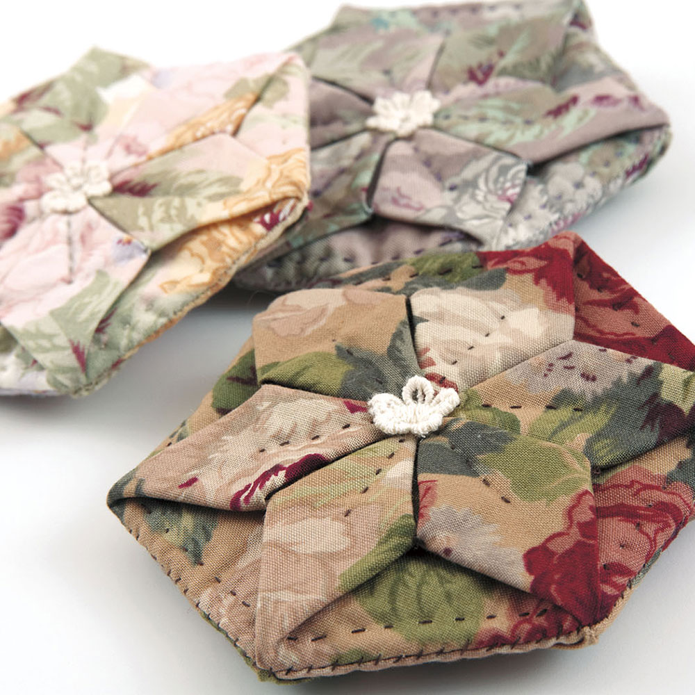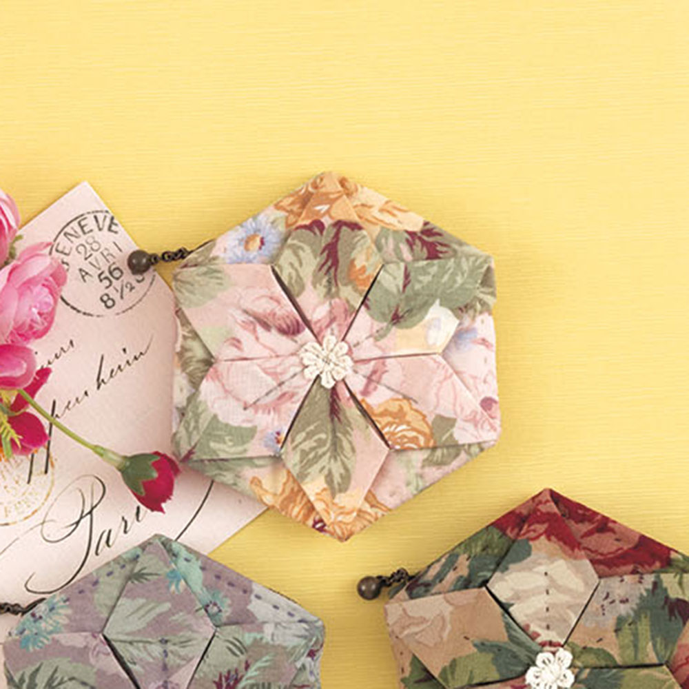 【キット作り方つき】布を折り畳んで、花のようなモチーフを仕立てて作るポーチです。コインや薬ケースにぴったりな、ポケットにも入る手のひらサイズ。それぞれ後ろも同じデザインです。