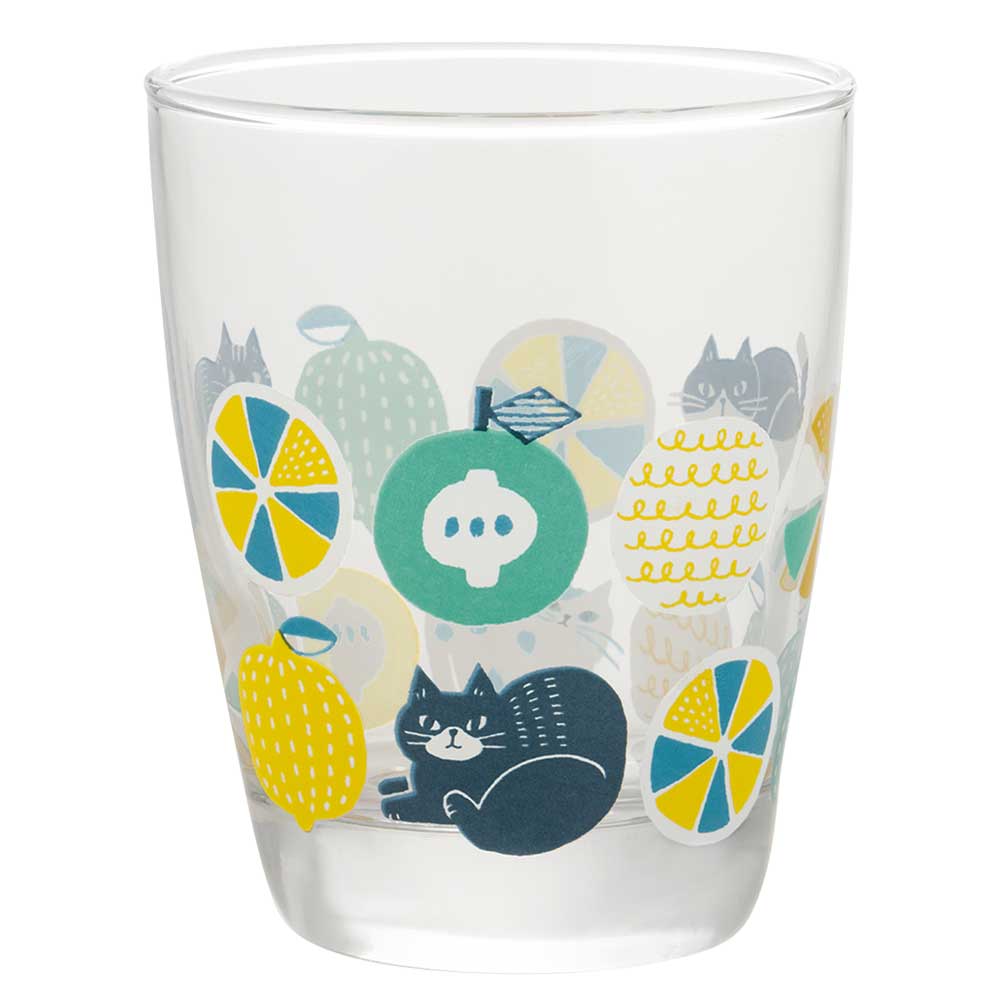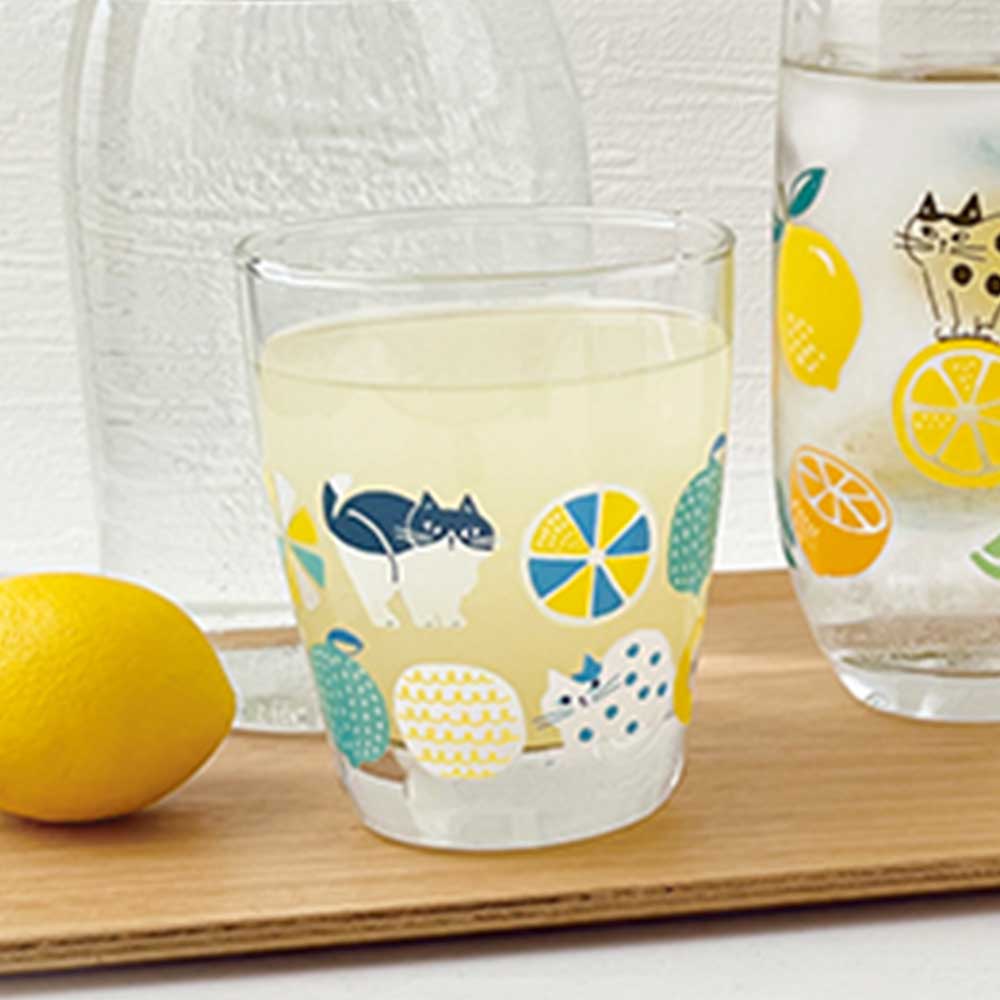 【完成品】ネコとフルーツがデザインされた爽やかなグラスシリーズです。ちょっと飲むのに丁度良いサイズ。