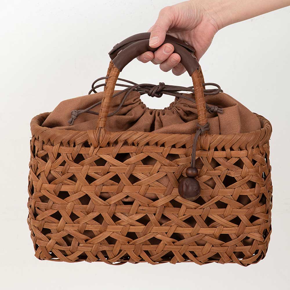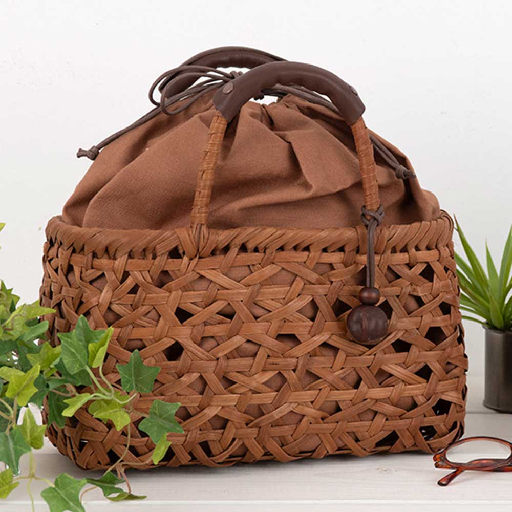 【限定10】【完成品】丁寧に作られたかごでみだれ編がおしゃれ。柿渋染めの巾着袋つきで安心。また用途に合わせて取り外しても。ハンドルにとり外し可能な革製カバーがあり持ちやすく、とちの実パーツもアクセントになっています。ひごの表面を丁寧に削り磨き上げていますので、統一感のあるしなやかな感触です。使うほど黒く艶やかに変化します。