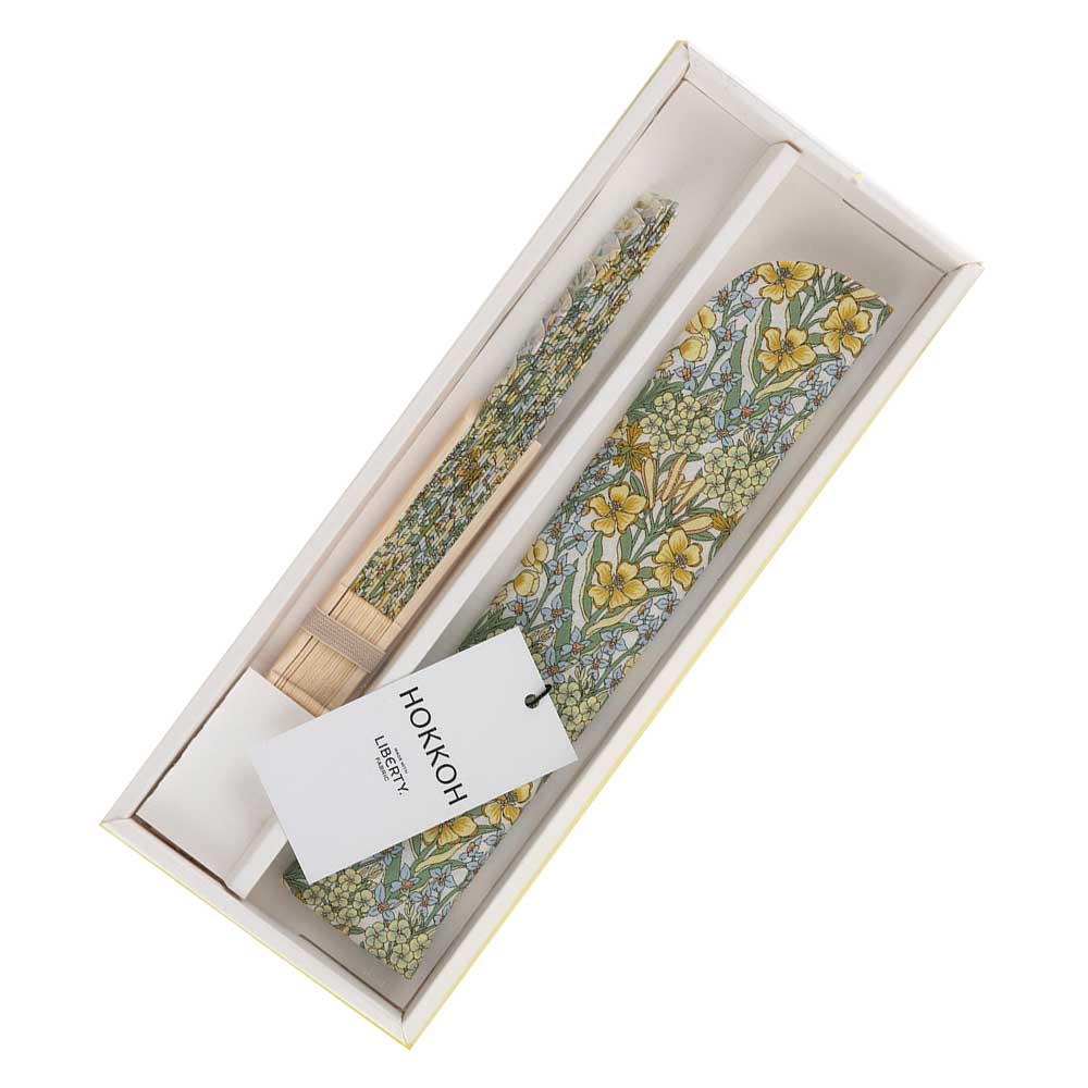 【完成品】女性に人気のある丸い形状のシェル型の扇子と、持ち運びやすく汚れや傷から守るための扇子袋も同柄で揃えた上品なセット。箱入りでお届けするので、贈り物にもピッタリです。国産の上質な生地を手掛ける北高とリバティがコラボした小花柄です。