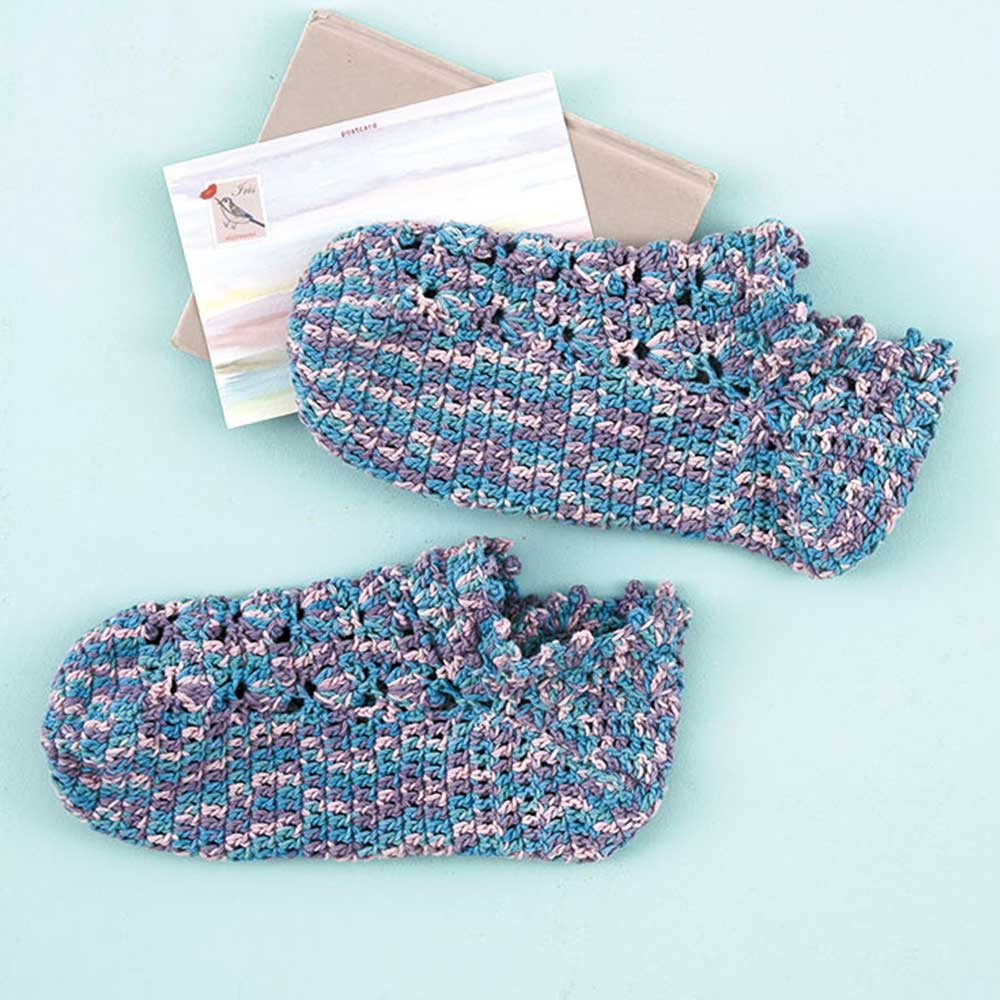 【キット作り方つき】柔らかく肌触りの良いコットンで編む、アンクル丈のルームソックスです。適度な透け感の編地と、履き口のピコット編みで可愛らしさをプラスしたデザイン。カラフルな段染め糸なので楽しく編めます。コットン100%なので履き心地もよく、洗濯もOK。中級以上の方へ。
