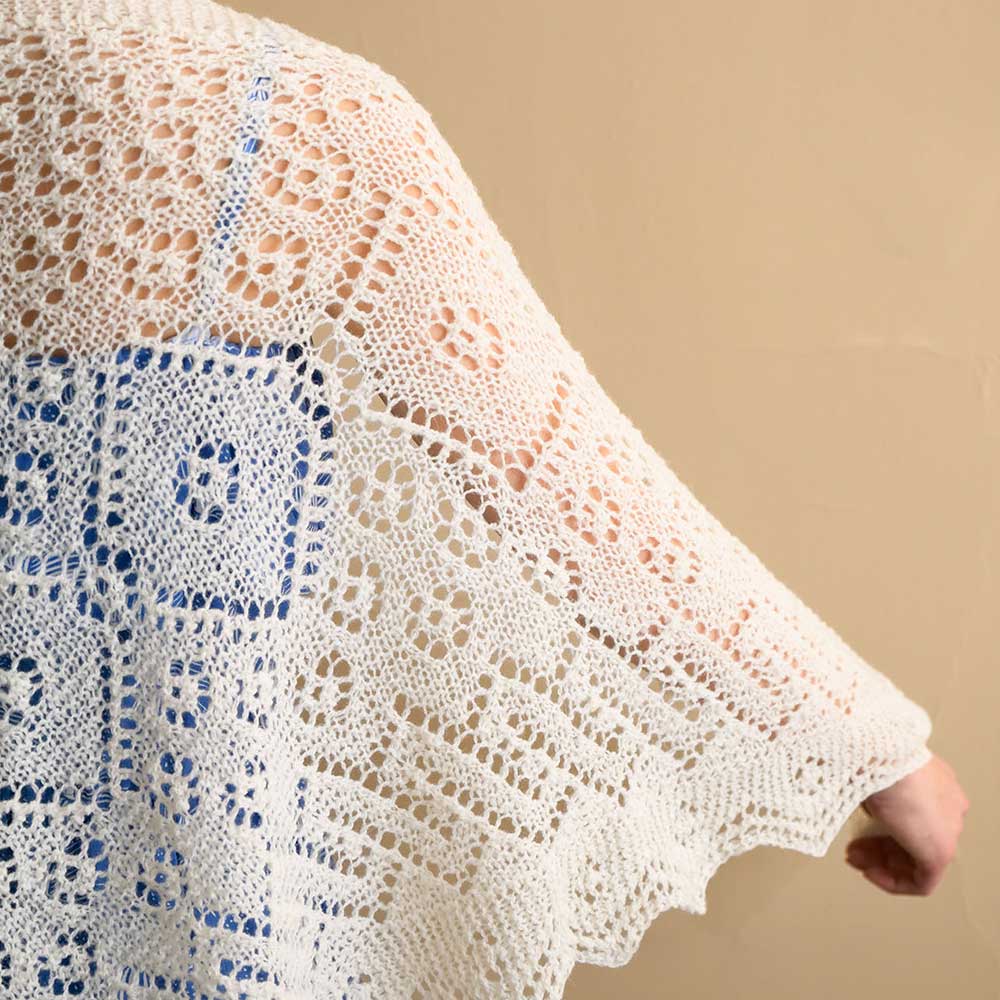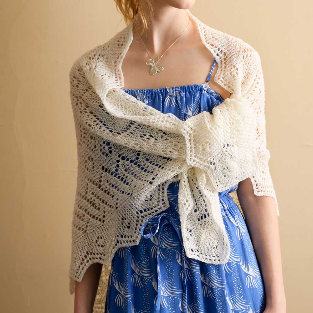 【キット作り方つき】2本撚りのシェットランドレース糸で 編む、憧れのショール。外側の長いエッジから目を拾い、三角に編み進みます。中級の方へ。