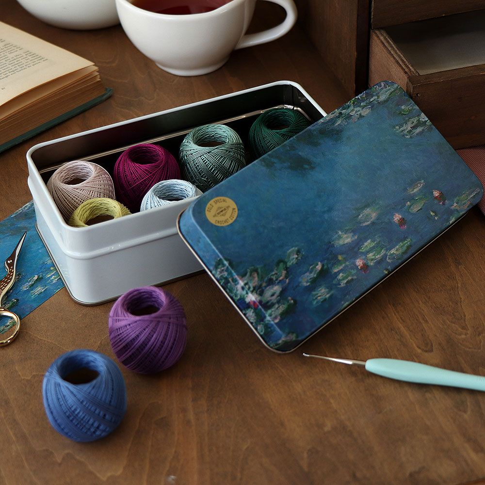 【限定50セット】上質なエジプト綿から仕上げた繊細な40番手のレース糸を、5g玉巻×8色セットした限定販売のアソートBOX。モネ「睡蓮」の淡く涼やかなイメージした新発売6色に2色を加えた8色アソートです。立体的な睡蓮の編み図がダウンロードできるQRコードが付いています。美しいオリジナル缶に入り、プレゼント用としてもおすすめです。