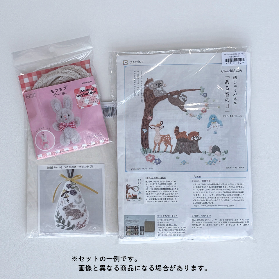 人気刺しゅう作家さんのどうぶつデザインの刺しゅうがたっぷりと楽しめる、どうぶつ刺しゅうキットを集めたスペシャルなお楽しみ袋です。人気作家さんのどうぶつがモチーフのキットが計3点入っています。基本のステッチでの刺しゅうがほとんどですが、刺しゅう糸の色やデザインは様々で、作家さんそれぞれの魅力を存分にお楽しみいただけます。