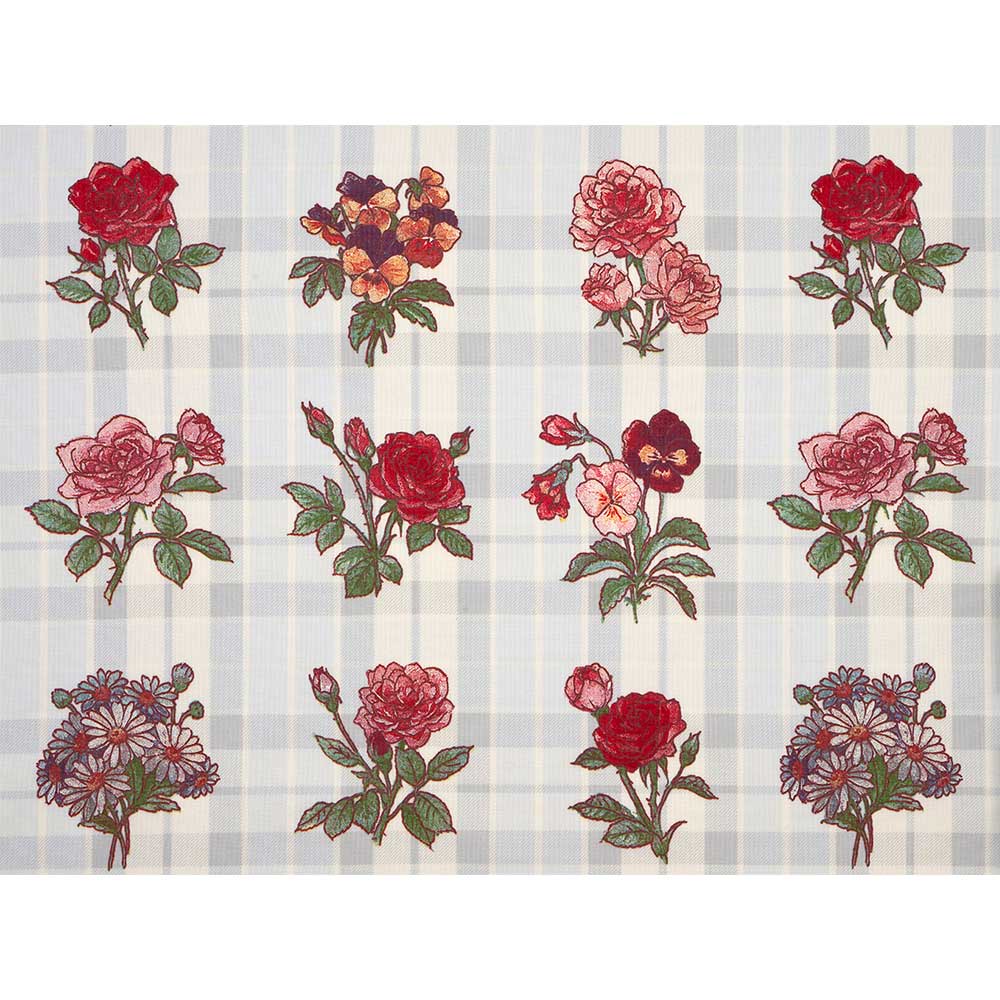 鷲沢玲子さんデザイン。格子柄の上に約8×7cmのフラワーモチーフを描いた、エレガントなプリントです。不和ラーモチーフを切り取って使っても。