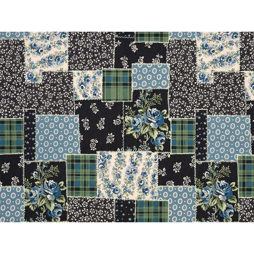 いろいろな花柄や格子柄をつなぎ合わせたようなプリント。黒とブルーのトーンでシックな雰囲気です。スカートなどにしても。