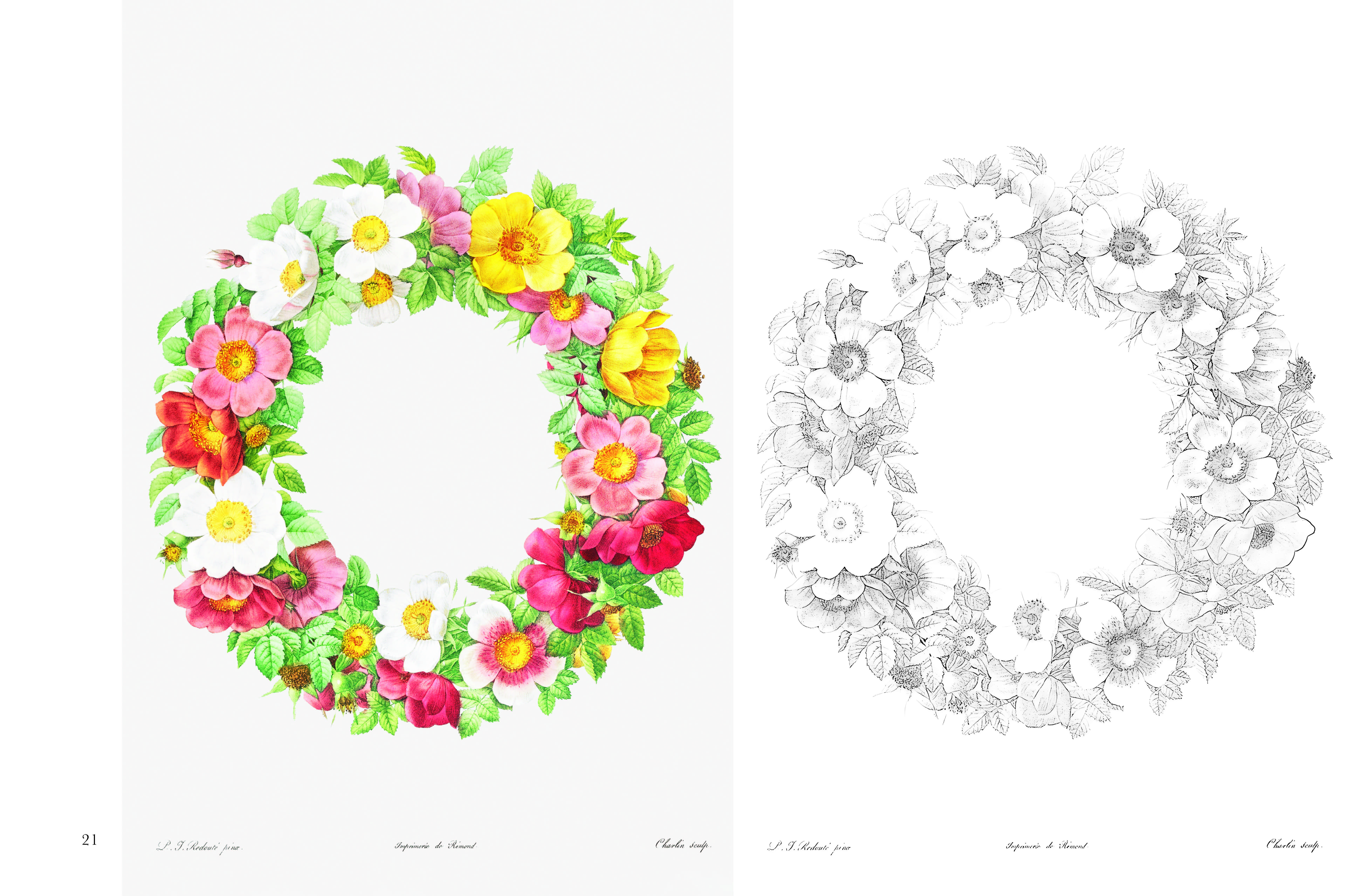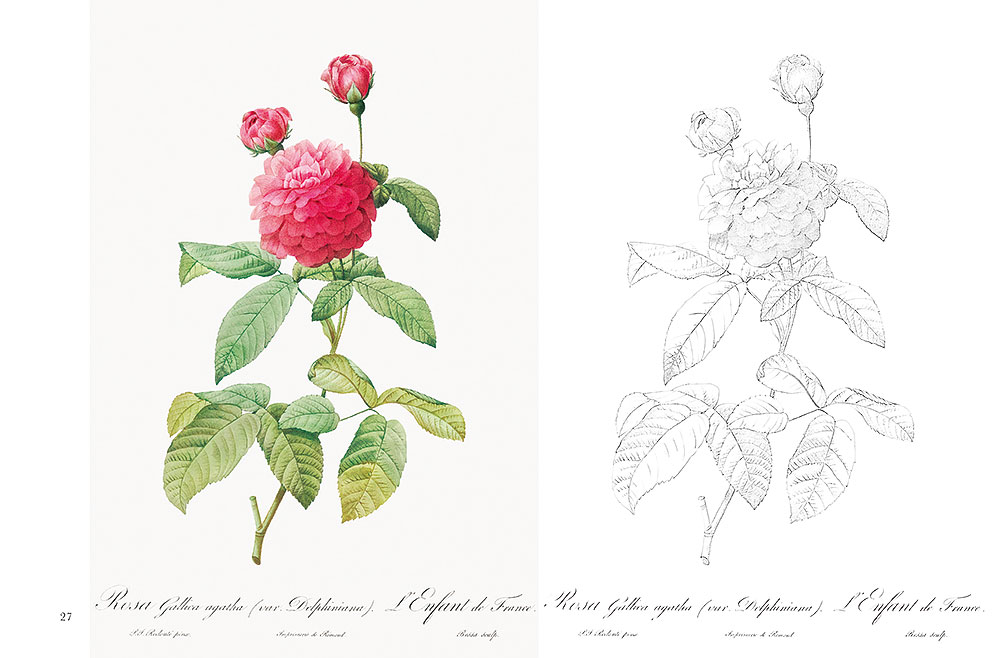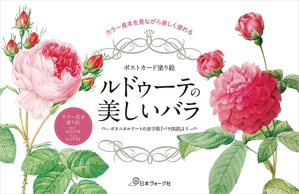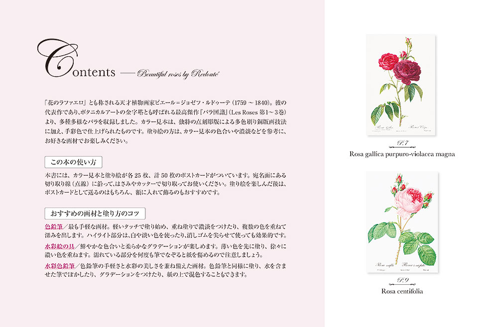 「花のラファエロ」とも称される天才植物画家ピエール=ジョゼフ・ルドゥーテ(1759 〜1840)。彼の代表作であり、ボタニカルアートの金字塔とも呼ばれる最高傑作『バラ図譜』(Les Roses 第1〜3巻)より、多種多様なバラを収録。塗り絵と見本が横並びとなっているので、見本を見ながら楽しく塗ることができます。色鉛筆はもちろん、クーピーや水彩画にも使用できるやや厚手の用紙を使用。塗り絵・見本各25枚、計50枚を掲載。