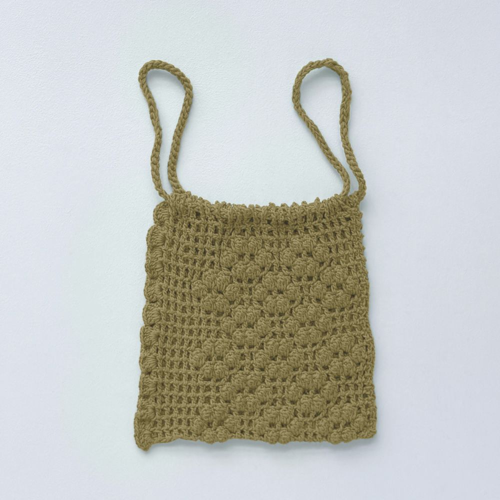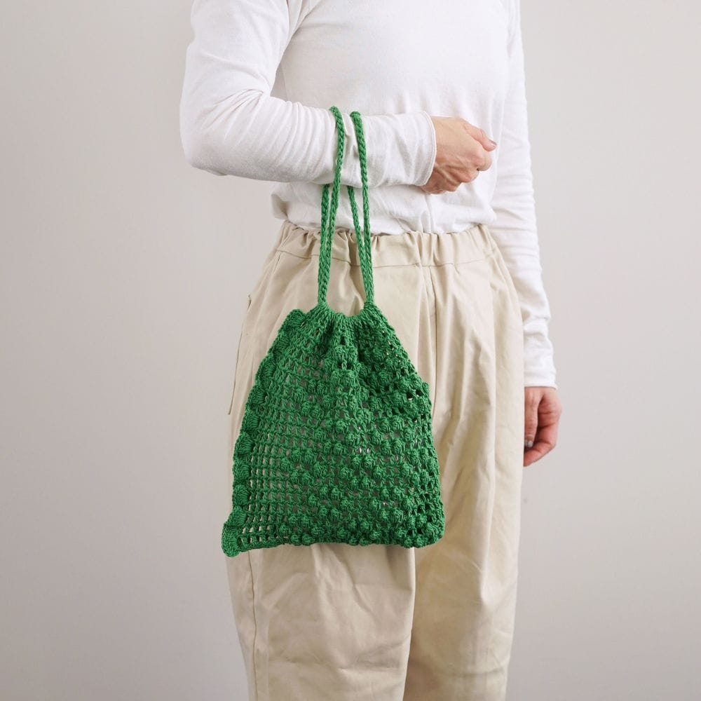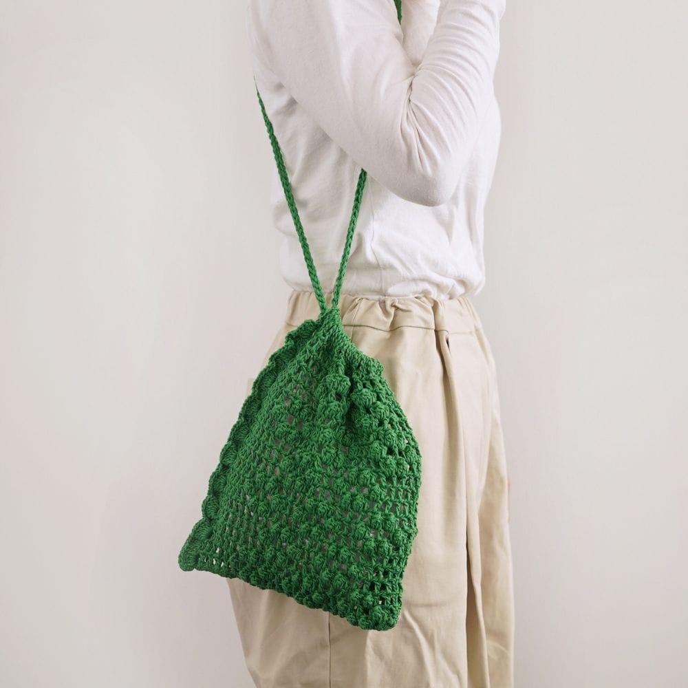 引き抜き編みのコードで編んだひもは長さを変えられるので肩にかけて使うこともできますよ。