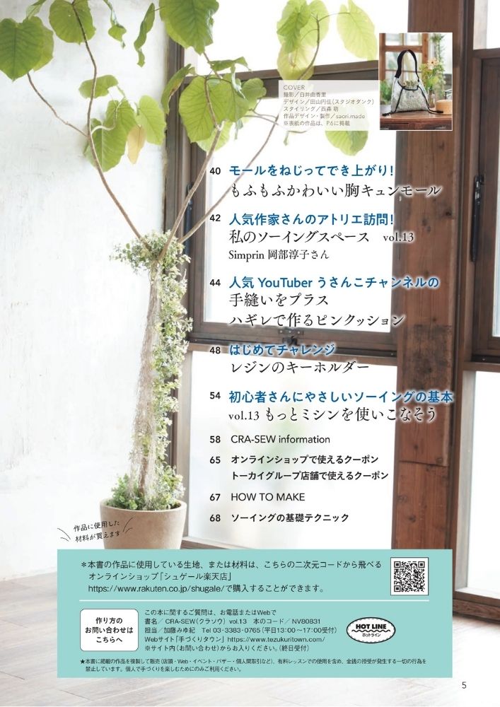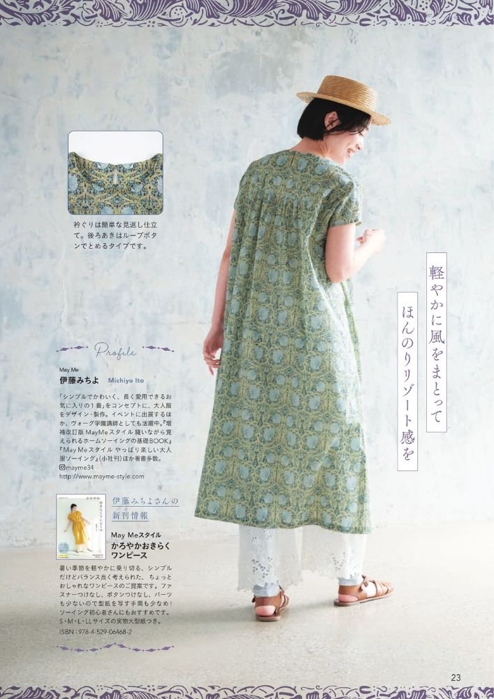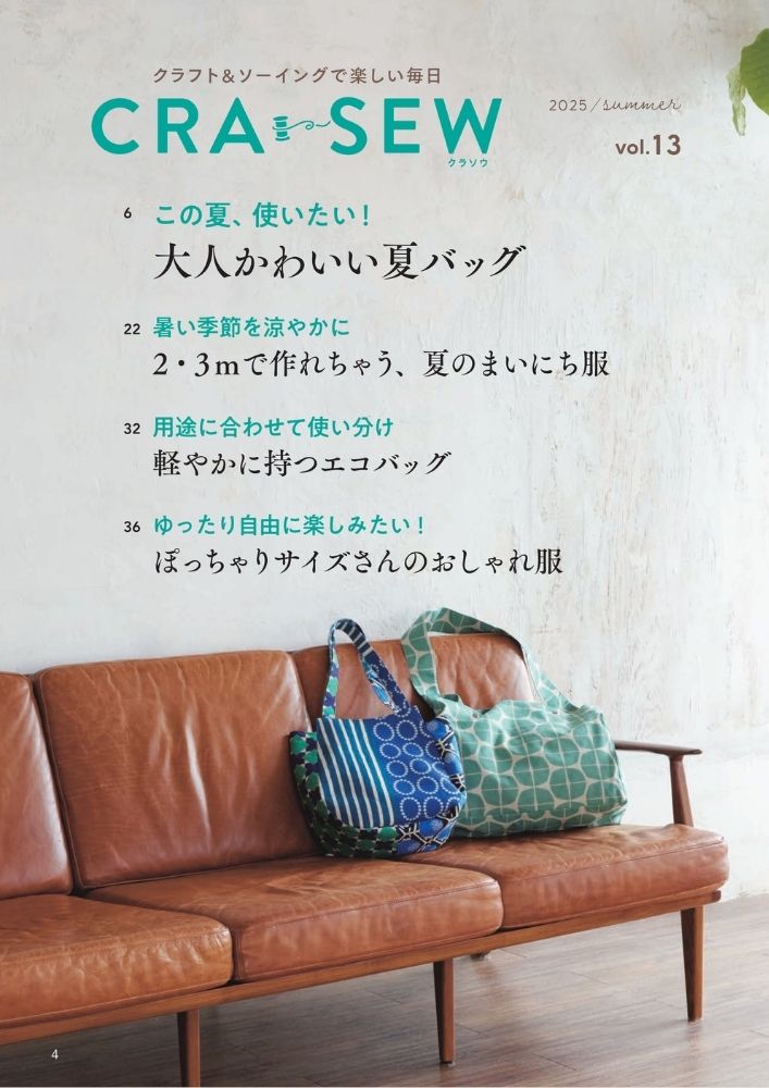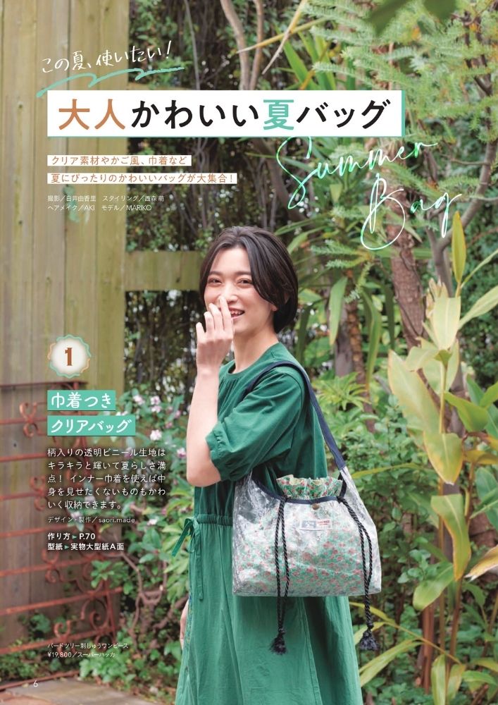 巻頭特集は、「この夏使いたい!大人かわいい夏バッグ」クリア素材や巾着バッグ、柄バッグなど夏にぴったりなバッグをたっぷり紹介。「2m・3mで作れちゃう、夏のまいにち服」「ぽっちゃりサイズさんのおしゃれ服」「エコバッグ」など盛りだくさんの内容。実物大型紙2枚つき。