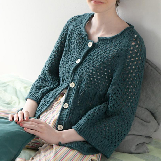 肌触りの良いコットン糸で編んだ、とても着やすいカーディガン。2種類の透かし模様を組み合わせて、ねじり1目ゴム編み風の模様で引き締めます。シックなグリーンで大人っぽく編みましたが、カラー展開が豊富なので、ぜひお好きな色で編んでみて。