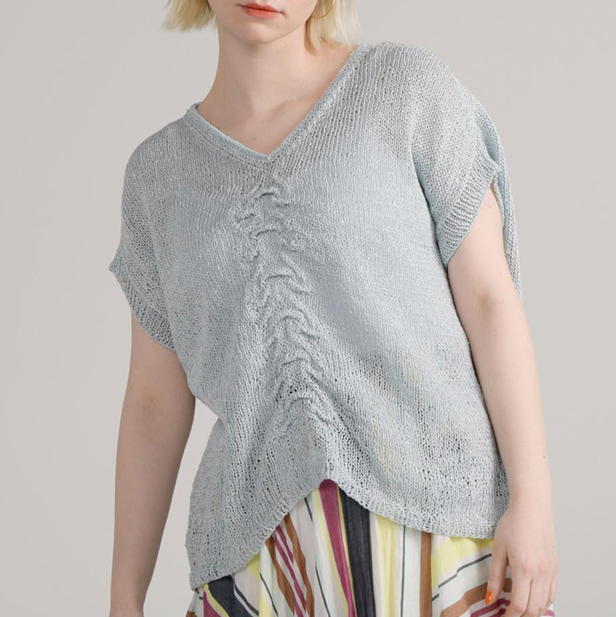 さらりとした糸で、ゆったりと風の抜けるウエアをデザインしました。前身頃のセンターにはタック編みをすることでギャザーを寄せ、ちょっとユニークなシルエットを作っています。肩下がりのラインは簡単に編めるように、引き返し編みではなく端目を立てた減目にしてみました。製