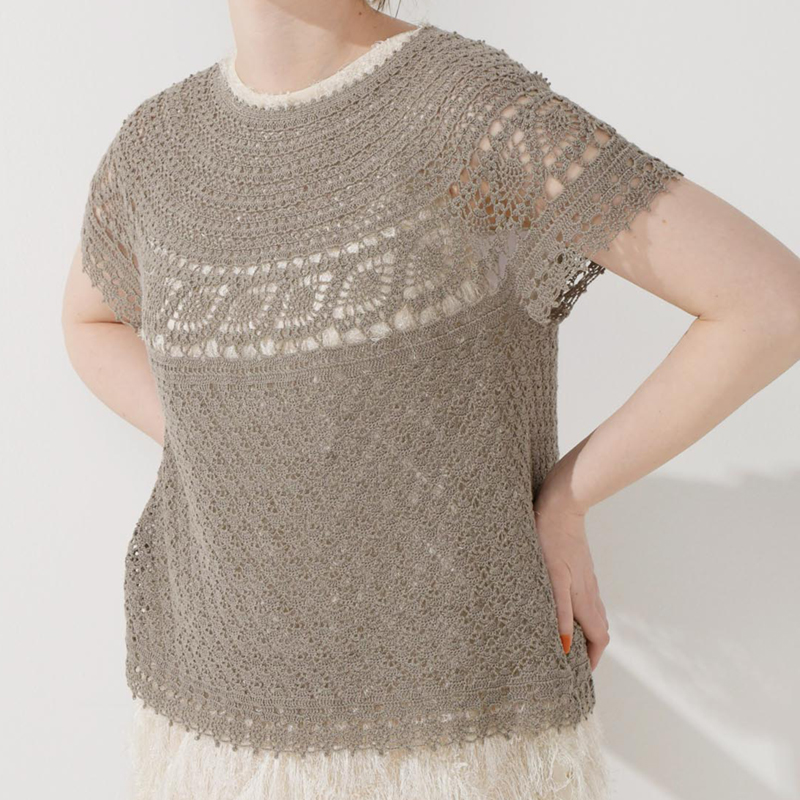 すっきりとしたシルエットが魅力の丸ヨークのプルオーバー。パイナップル模様のブレードを編み、ヨーク部分はブレードから拾い目をして編んでいきます。レーシーなブレードの透け感が涼しげなアクセントに。さらりとしたサマーヤーンが肌触り良く、快適な着心地。飽きのこない、長く愛用できるデザインです。