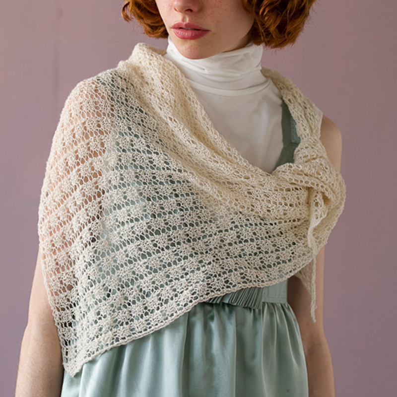 ガーター編みをメインに、かけ目と2目一度、3目一度で編むベーシックな模様のショール。サンプルの生なり以外も使いやすい色味の糸で、ソリッドな単色ではなく少し揺らぎのある染まり方をしています。間違いのない肌触りと軽やかな暖かさで毎日持ち歩きたくなるショールになりますよ。