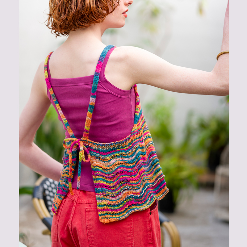 後ろで結ぶエプロンスタイルが、暑い日でも涼しく着られるポイントです。波のような透かし柄が夏らしい、カラフルなマルチカラーのキャミソールです。