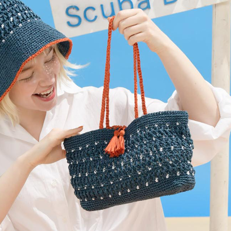 ネイビー×オレンジのコントラストに、編み込み模様の白いドットが効いた、爽やかなバッグ。オレンジ色のタッセルは見た目が可愛いだけでなく、入れ口をとじる機能的な役目も果たしています。