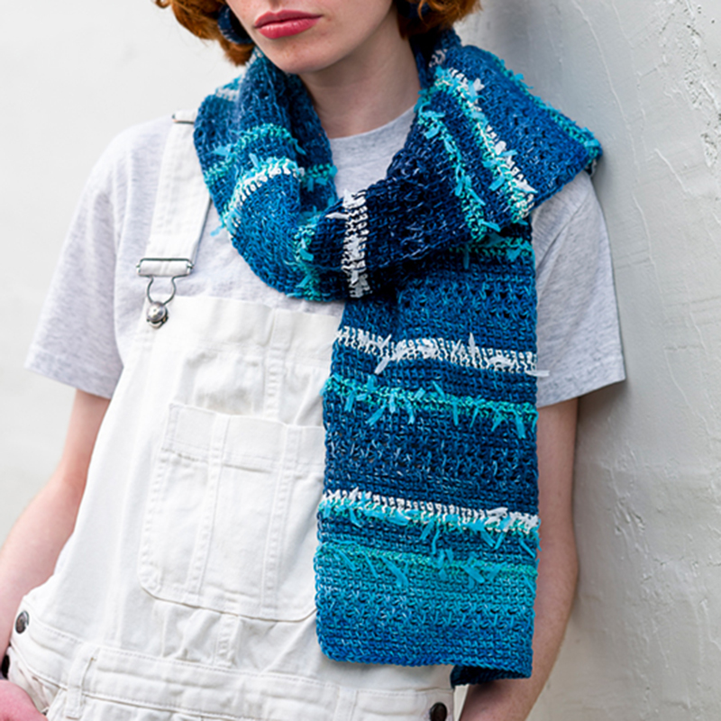 材料:パピー クアトロディグレイド 青系段染め(11)190g/2玉。フロトン 青緑(10)30g/1玉、白(1)20g/1玉。