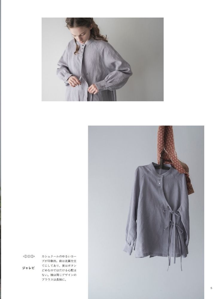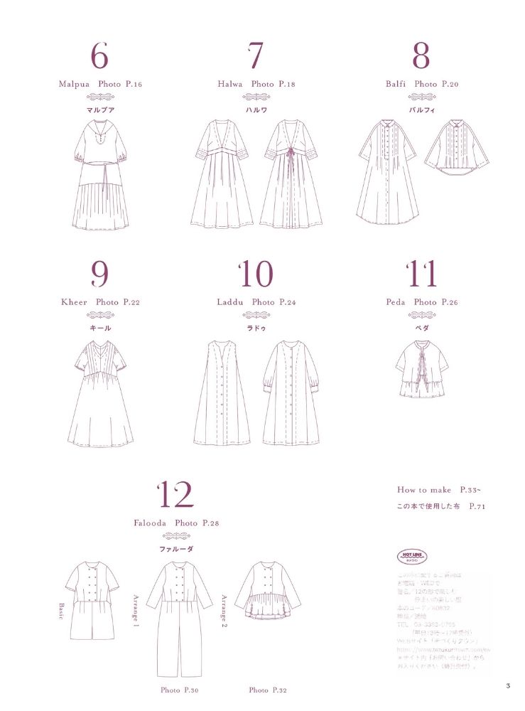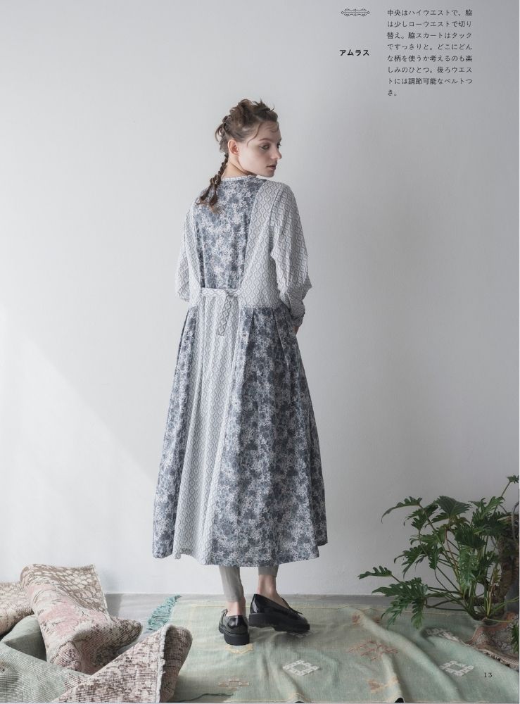 ディティールにこだわりのある12の形を提案。ワンピース、ブラウス、セットアップ、オールインワンなどバラエティに富んだラインナップの服はどれも作りがいがあり、すっと背筋が伸びるような美しい仕上がりです。1(S~M相当)、2(L~LL相当)の2サイズ展開。縫い代込みの実物大型紙つき。