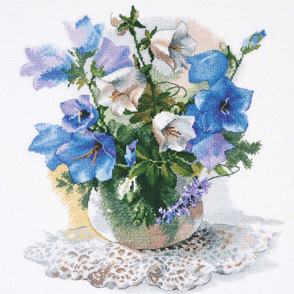 【キット作り方つき】青や紫、白の小さなベル型の花を咲かせる可憐なベルフラワーを描いたクロスステッチ作品です。上級の方向き。ロシア・OBEN社製。