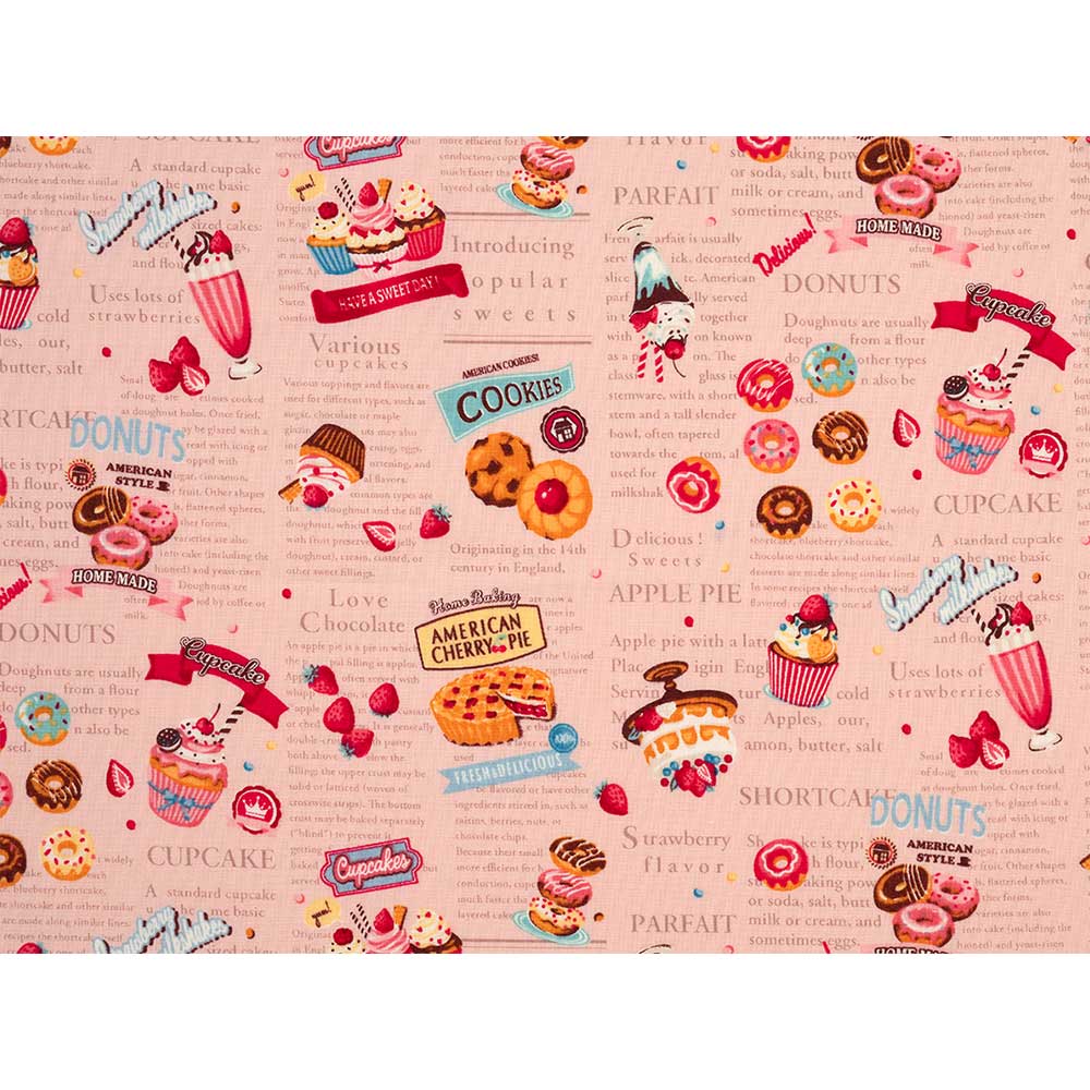 美味しそうなスイーツと英字のレシピを描いた楽しいデザイン。バッグや小物作りなどに。