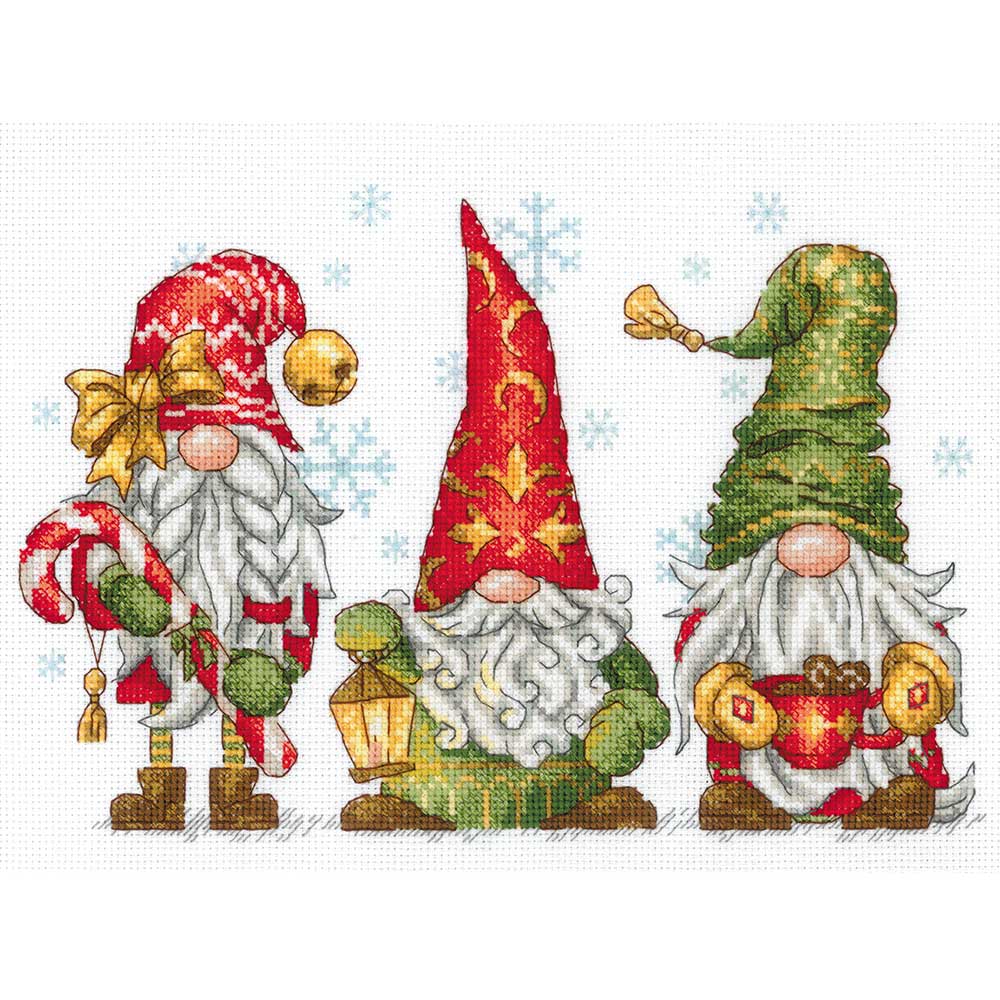 【キット作り方つき】大地を守る精霊とされる小人、赤や緑の帽子を被った陽気なノームを描いた可愛らしいクロスステッチ作品です。中~上級の方向け。リトアニア・RIOLIS社製。