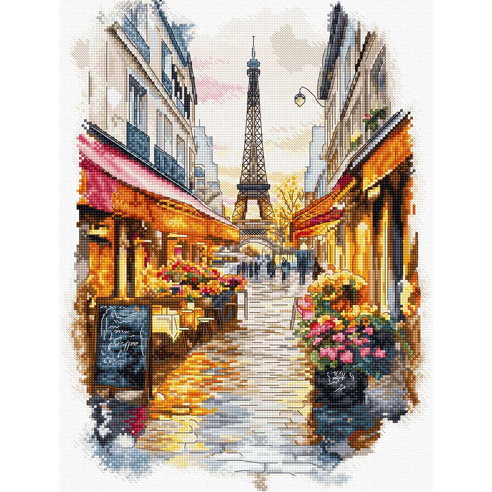 エッフェル塔を望む、夕暮れ時のおしゃれなパリの街並みを描いたクロスステッチ作品です。上級の方向け。イギリスのLETISTITCH社製(レティーステッチ)。