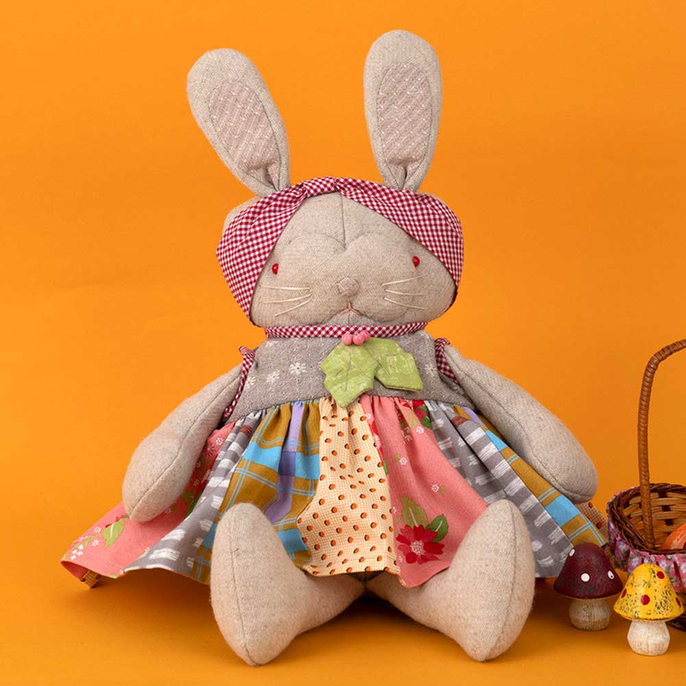 【キット作り方つき】可愛らしいボーダープリント布のワンピースとチェックのバンダナ、木の葉のブローチでおしゃれに。ウール地で仕立てる安定感のあるボディーも魅力の縫いぐるみです。