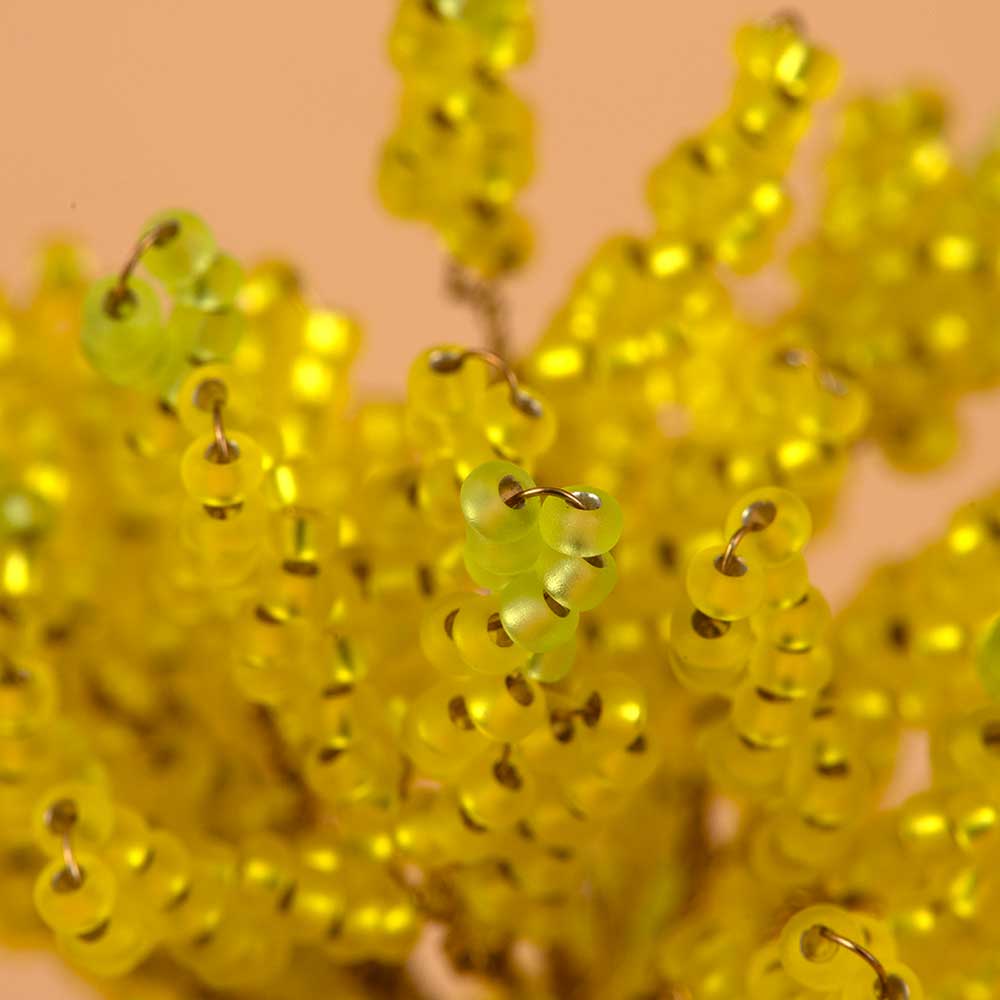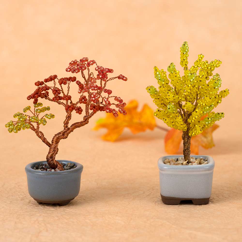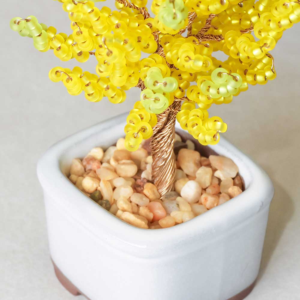 【キット作り方つき】ワイヤーにビーズを通して、ねじるだけで作れる小さな盆栽キット。枝や葉を自由に動かせるので本物の盆栽のように好みの樹形に仕立てることもできます。長寿、生命力の象徴とも言われる銀杏をまっすぐに伸びた樹形、黄金色に見える鮮やか黄色をメインに作りました。