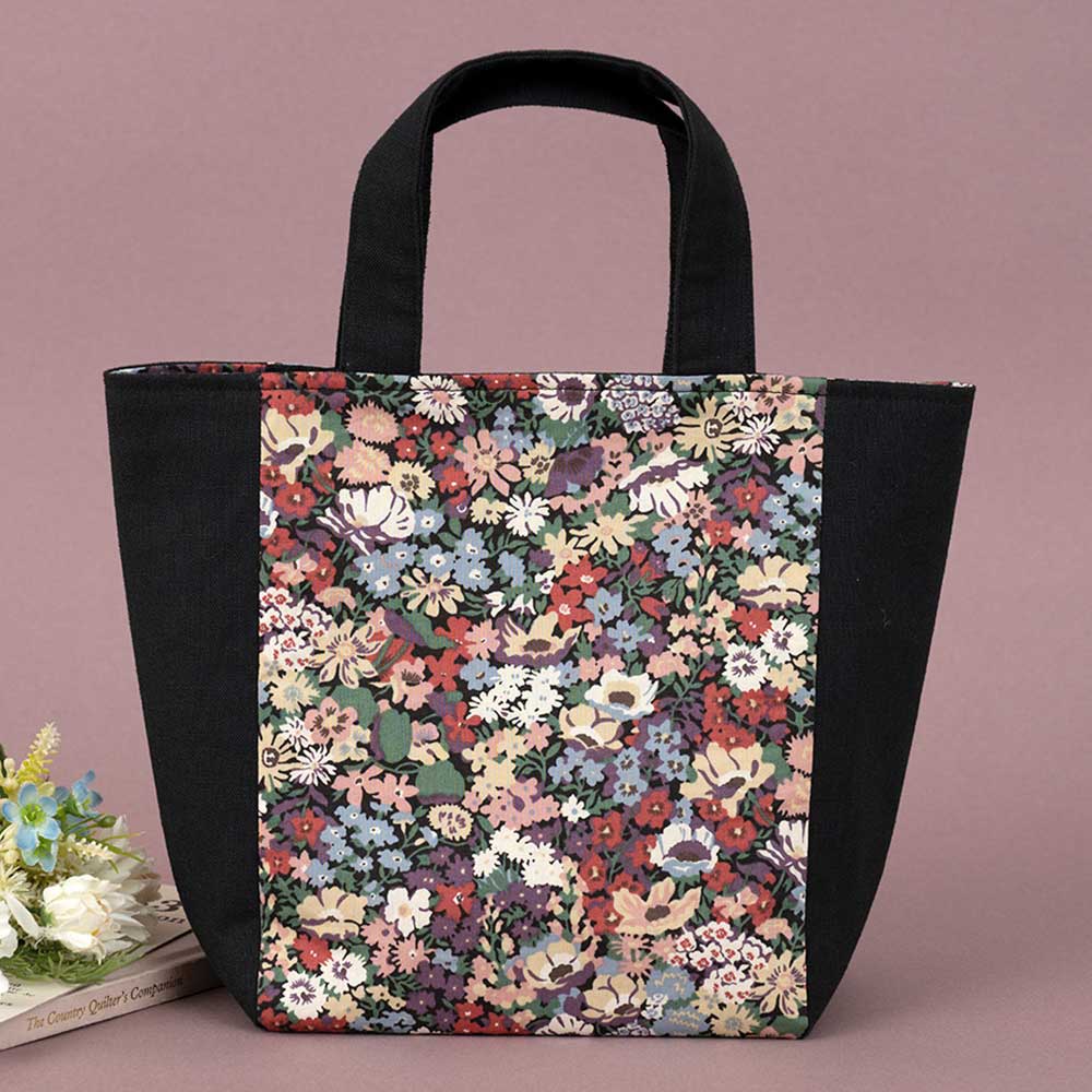 【限定80】【キット作り方つき】シックなリバティ・ファブリックスで作るバック。黒地の花柄をサイドの無地のブラックが引き立てる、コンパクトサイズです。