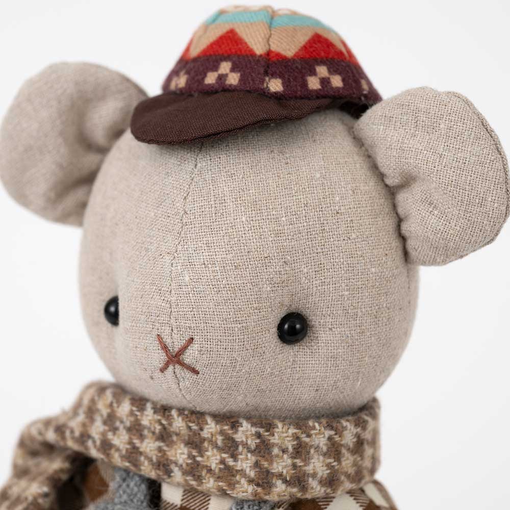 【キット作り方つき】帽子かぶってマフラー巻いて♪ お出掛け準備万端のクマの子。起毛素材で作るサロペットパンツもキュートです。組み立て式のスタンドつきでお届けします。