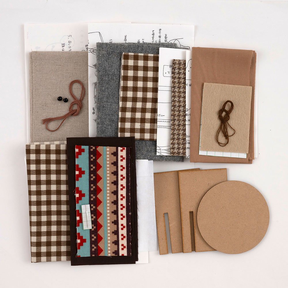 布、ボタン、刺しゅう糸、フェルト、ひも、厚紙、接着芯、虫ピン、ドールスタンド(組み立て式)