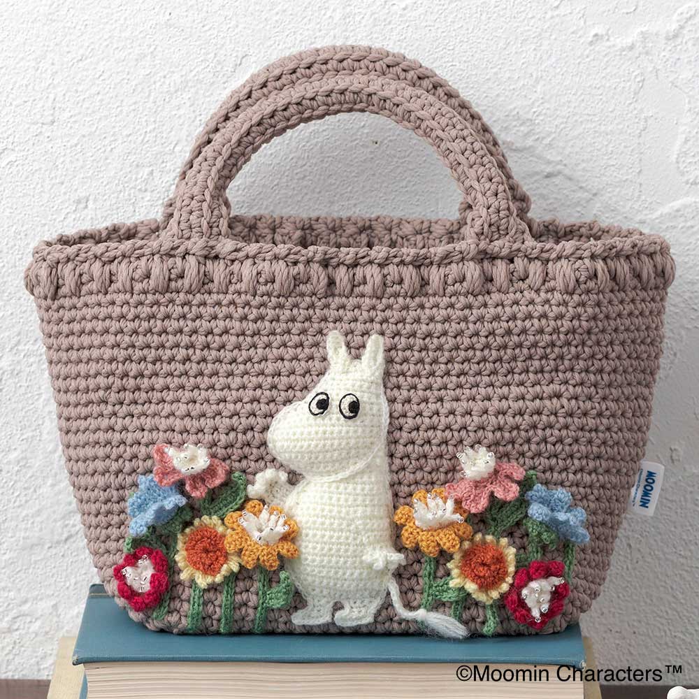 【キット作り方つき】細編みのバッグ本体に、別にかぎ針で編んだムーミンと花々をアップリケして仕上げます。かぎ針編み中級以上の方向きです。
