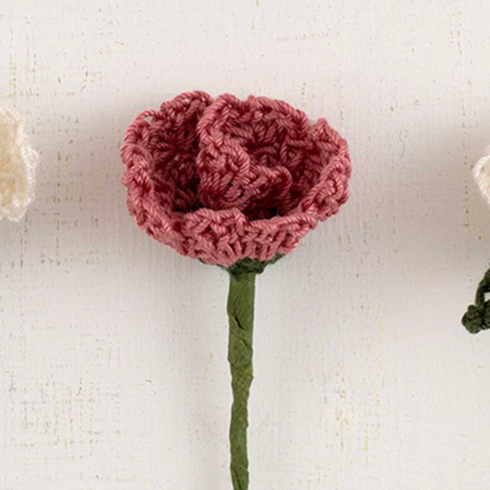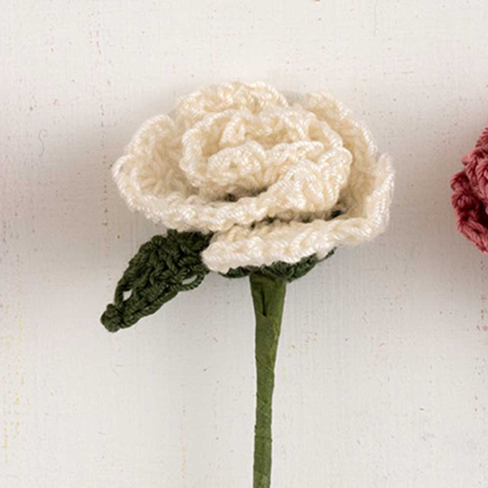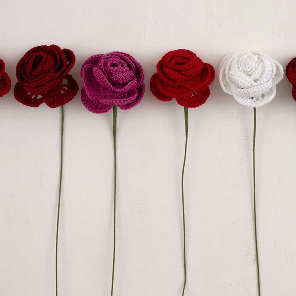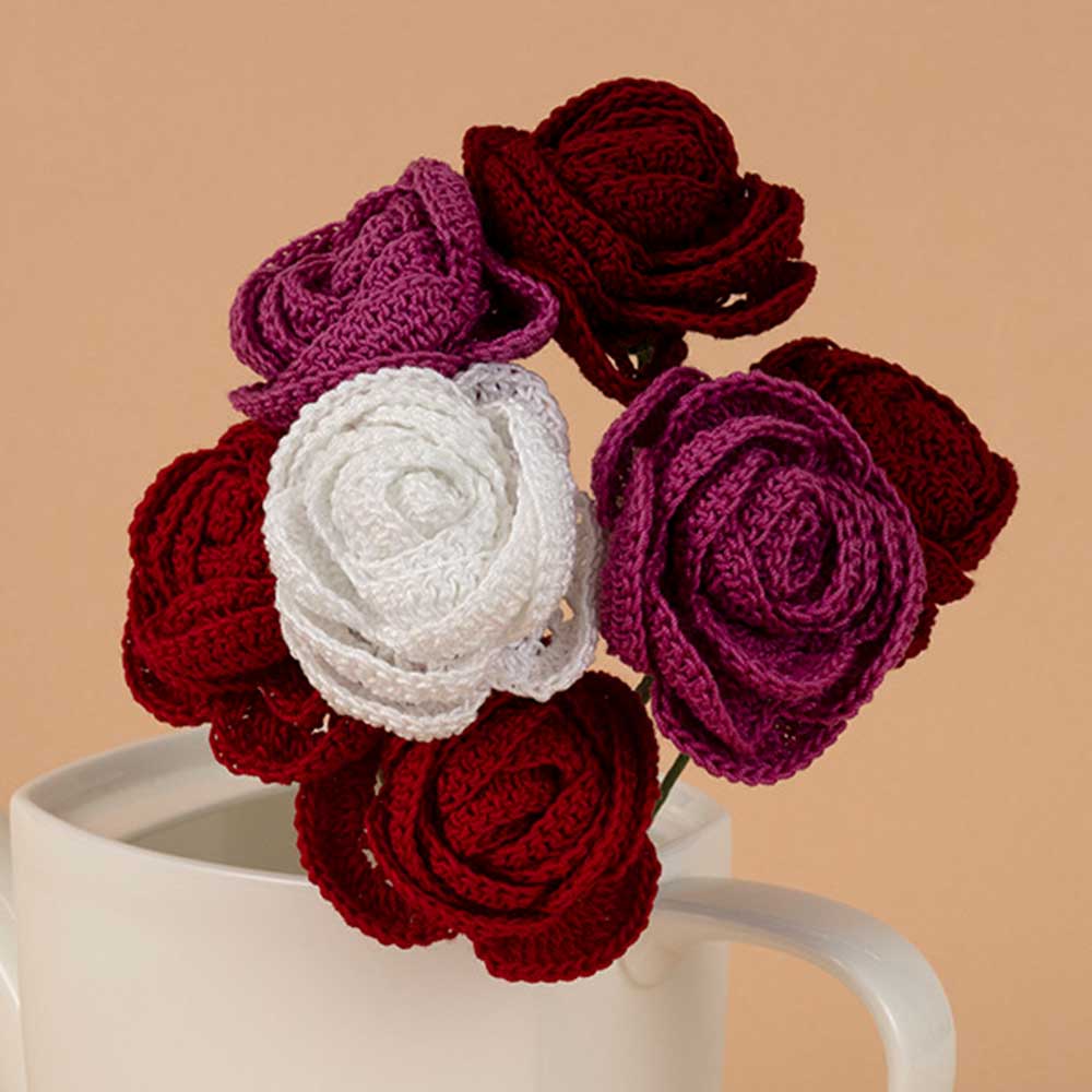 【キット作り方つき】【単品糸購入可】中サイズのバラ4色が各2個ずつ、計8個編めるセットです。がくはカップ状に編み、つめ綿少々を入れて仕上げます。