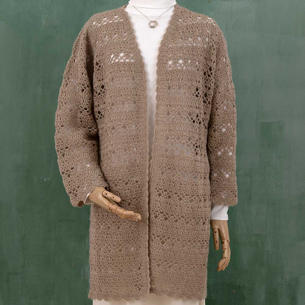 【キット作り方つき】編みやすくて肌触りもソフトな、着丈の長いカバー力のあるカーディガンです。ドルマンスリーブなので、中に着るウエアを選びません。中級の方にお勧めします。