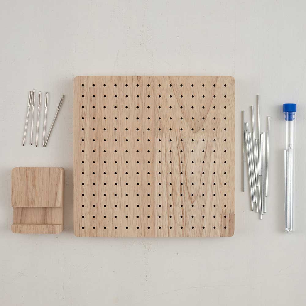 編みためたモチーフの形を整え、サイズをそろえる、ブロッキングボードです。付属のピンを穴に刺して、同じモチーフを何枚か重ねてピン打ちできます。四角いモチーフのほか、六角形や八角形などにも。どっしりとした素材なのでしっかりと止めておけます。同素材のスタンド付きで飾っても素敵。
