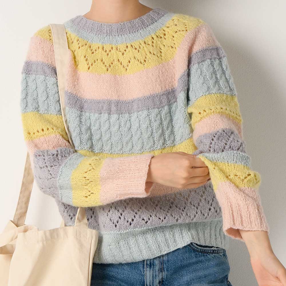 【キット作り方つき】【単品糸購入可】前後どちらを前にしても着られる、グレイッシュトーンのパステル調ボーダーニット。コットン混のモヘヤヤーンで、肌触りよく軽やかに仕上がります。上級の方へ。