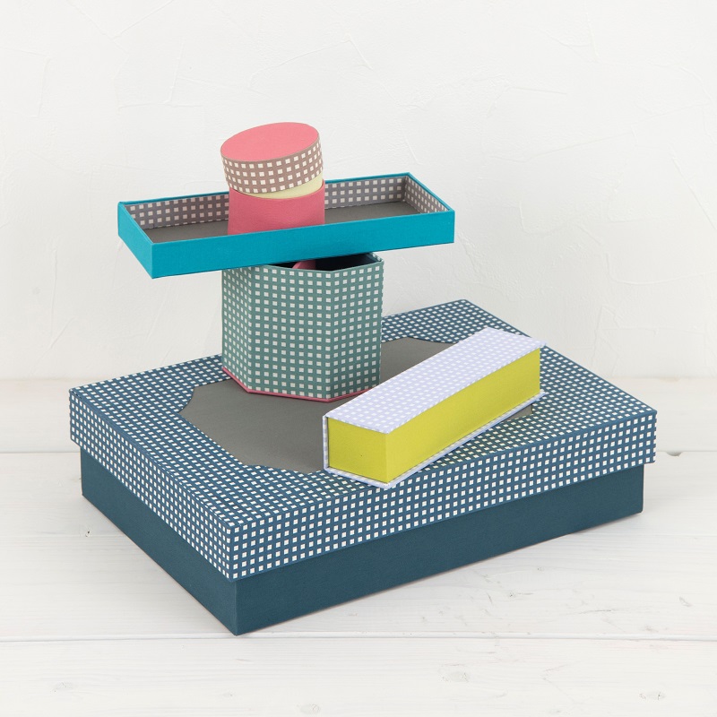 ベーシックな長方形・多面形・丸箱、蓋はブック型・つめかけ・かぶせ蓋と さまざまな形と蓋の作り方が体験できる5種類のキットです。 A4サイズのお道具箱に他の4種類がすっぽり入ります。