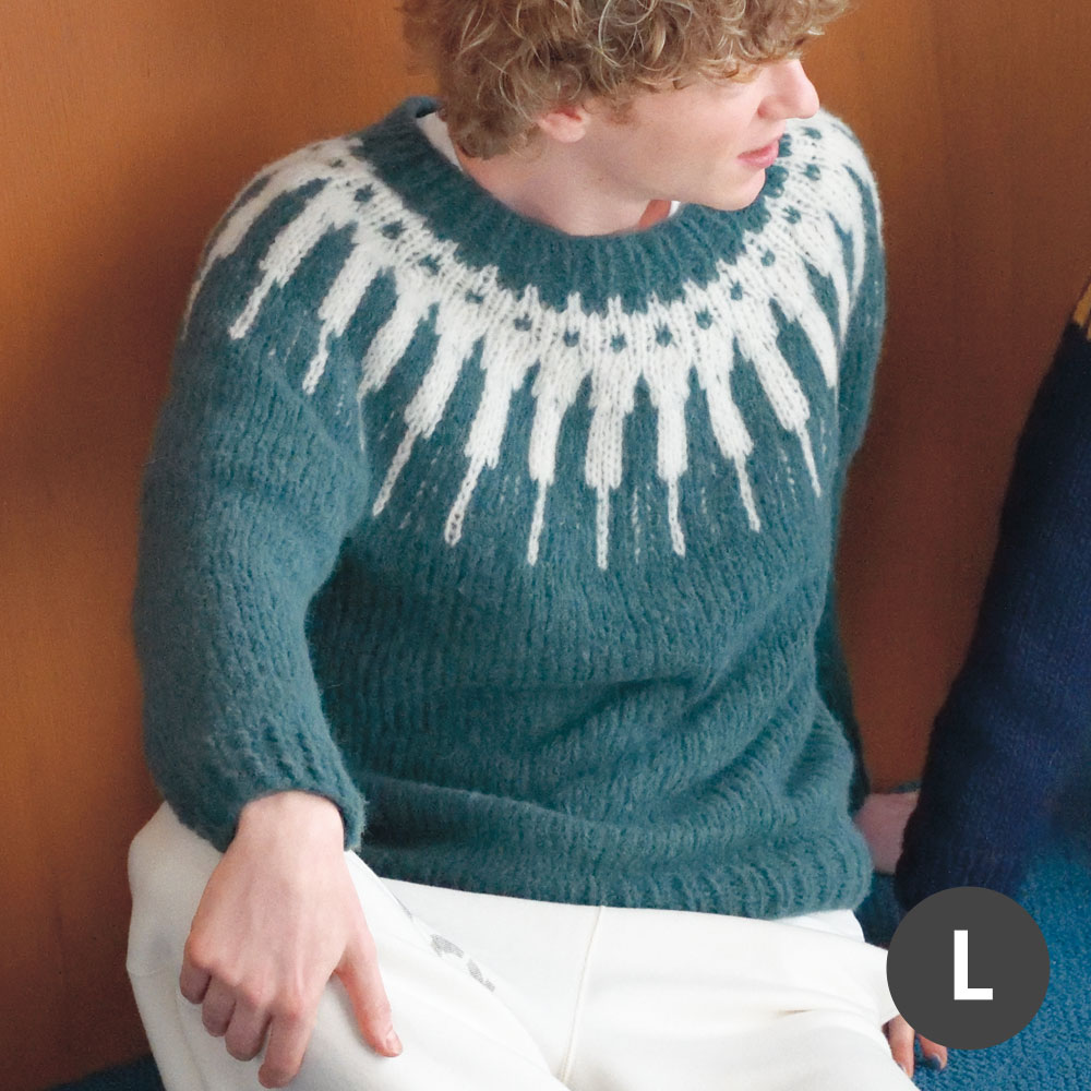 し、すっきりと魅せます。左は大胆な丸ヨークをふわふわの糸で軽やかに。糸の質感でシャープな模様の輪郭がにじみます。ボトムアップで編んでいます。