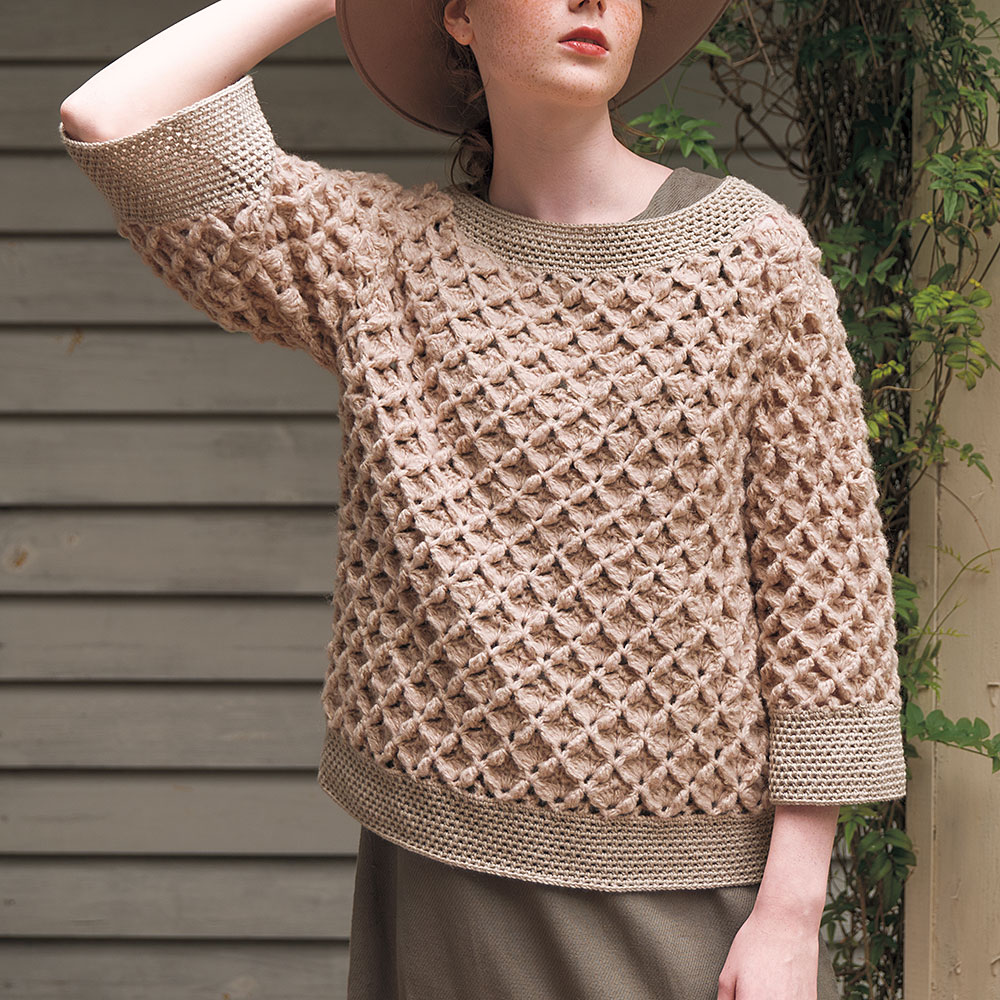 ボリュームのある模様を中長編みと鎖の縁ですっきりと引き締めた、2種類の毛糸の性質を活かしたメリハリがポイントのデザインです。格子になった玉編み模様に興味津々。気になる模様がたくさんあって、編みたいリストが渋滞しそう。