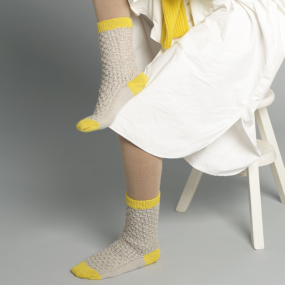 交差と穴あき模様を組み合わせた本体に、ポイントパーツに配色を入れたバイカラーソックス。つま先とかかとをあとで編むから、穴があいたら編み直しもできます。