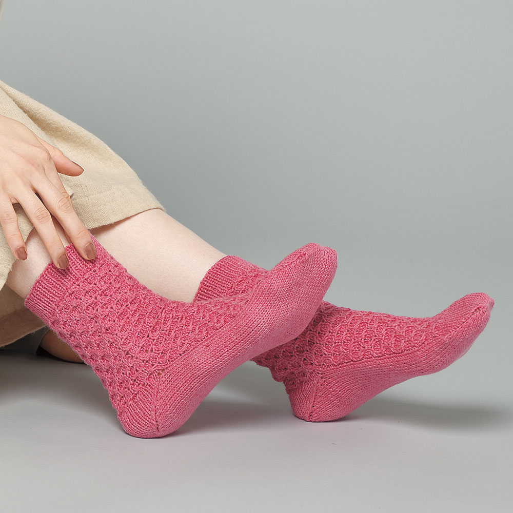 まっすぐに編む足首部分は模様編みの数を変えるだけで、簡単に好みの丈に調整で