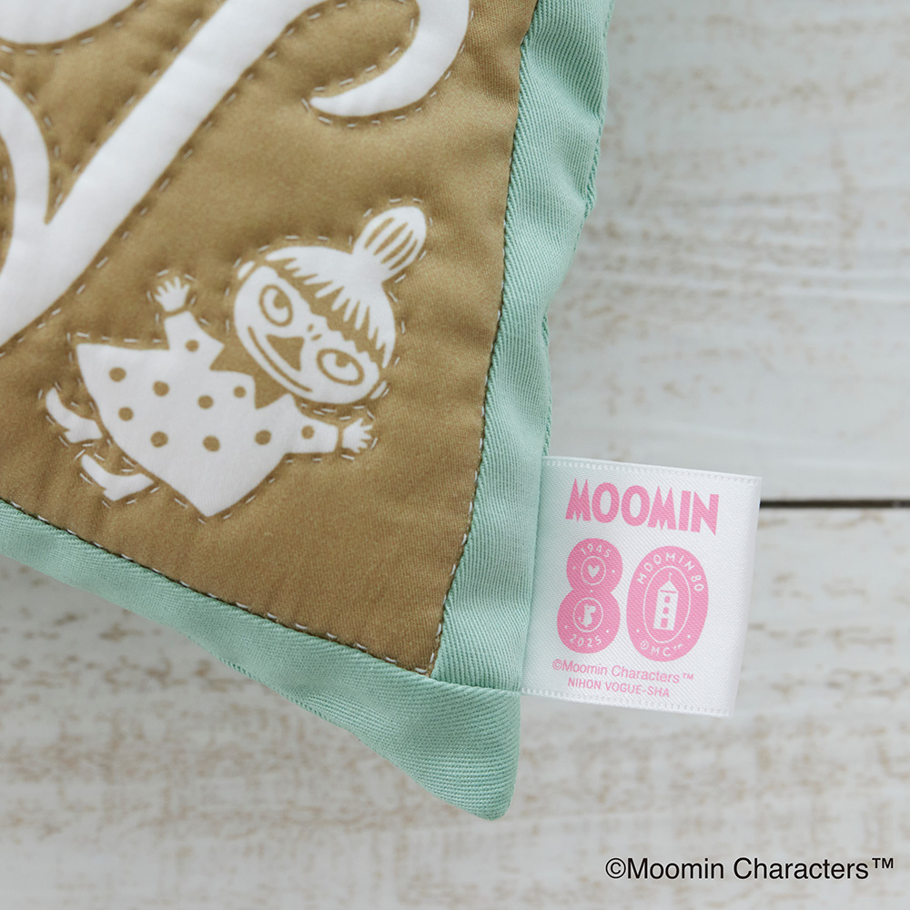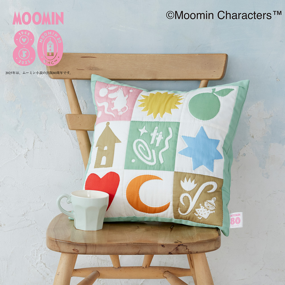 ムーミンは2025年で「ムーミン」小説1作目の出版80周年を迎えます。記念すべき年をお祝いするデザインを使用したキルトクッションカバーです。