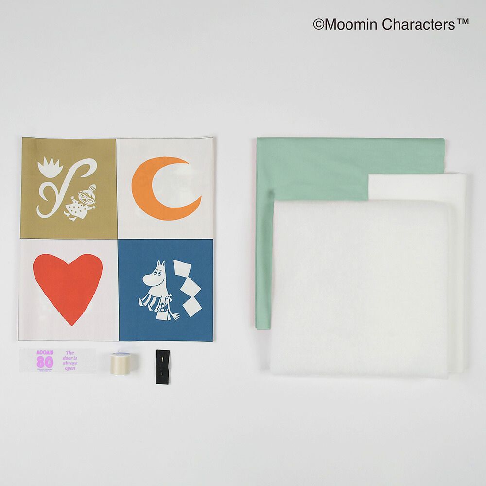 キットには、表面に使用するムーミンデザインの布が17デザイン20ピース分セットされています。お好みで9ピースを選んで、お好きな配置で作ることができます。