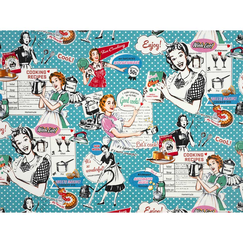 掃除や料理を明るくこなすアメリカ女性の笑顔が弾ける、レトロポップなプリント布です。バッグやキッチングッズなど、気分を上げる小物作りに。