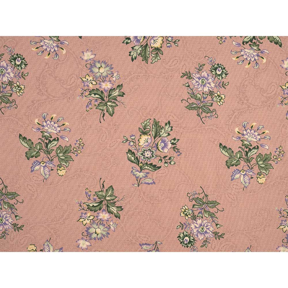 細かな植物模様入りのピンク地に、紫の花を描いたエレガントなプリント布です。抑えた色合いは、優しい印象のソーイングアイテムなどに。