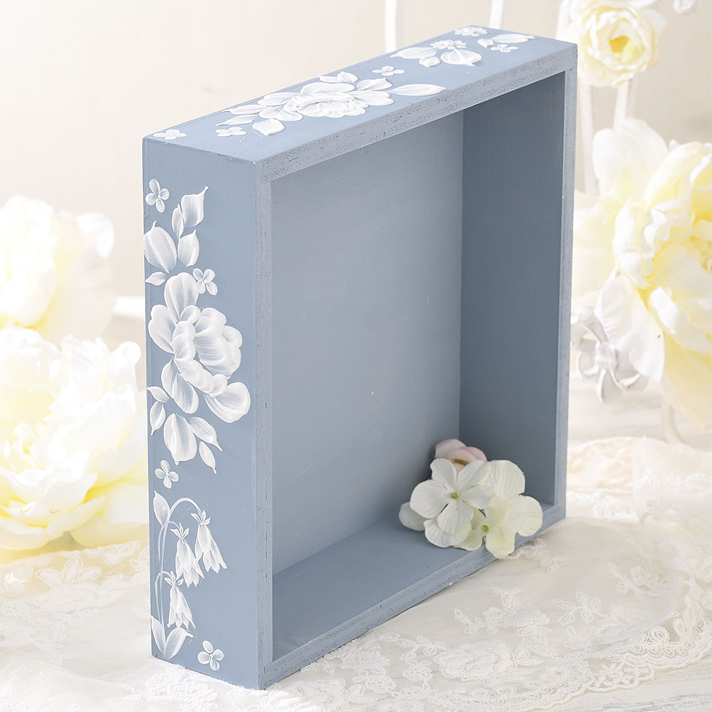 素材は、大げさではなく存在感のある正方形のボックス型のボード。サイドにも絵柄を入れるので、斜めから見てもきれいで小ぶりながらゴージャスです。 ※シルクスクリーンは含まれません。 『ペイントクラフトデザインズvol.23』65ページ掲載 監修:川島詠子