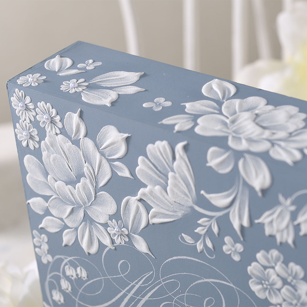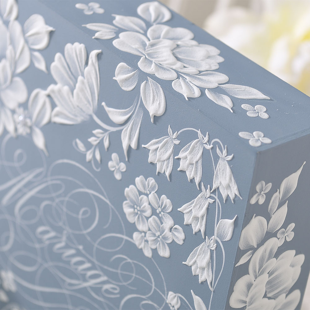 素材は、大げさではなく存在感のある正方形のボックス型のボード。サイドにも絵柄を入れるので、斜めから見てもきれいで小ぶりながらゴージャスです。