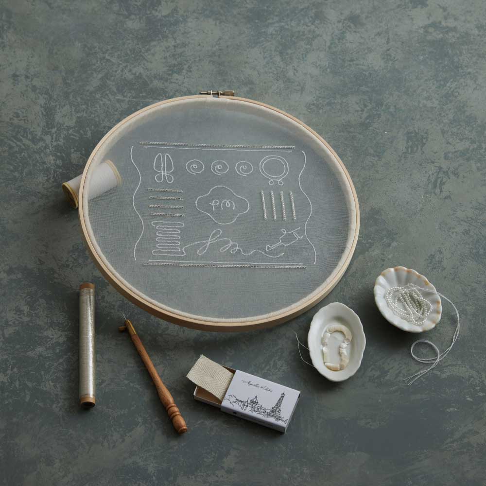 レッスンに必要な「リュネビル刺繍用クロシェ #80」と「オートクチュール刺繍におすすめ スタンド刺しゅう枠セット」はオプションにて別途お買い求めください。